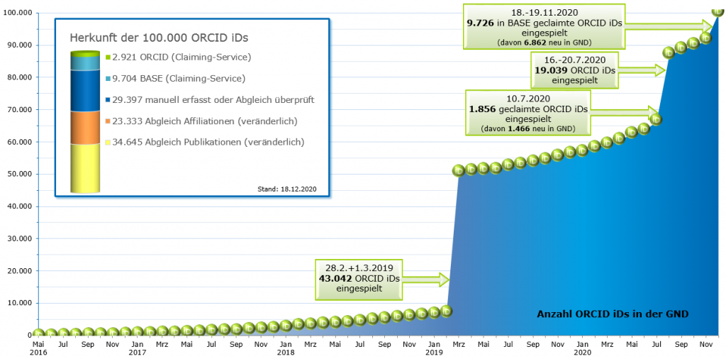 Das Jahr 2020 endet für das ORCID DE Projekt mit einer weiteren erfreulichen Entwicklung: Am späten Vormittag des 18. Dezember 2020 wurde die 100.000ste ORCID iD in einem Personendatensatz der Gemeinsamen Normdatei (GND) erfasst!