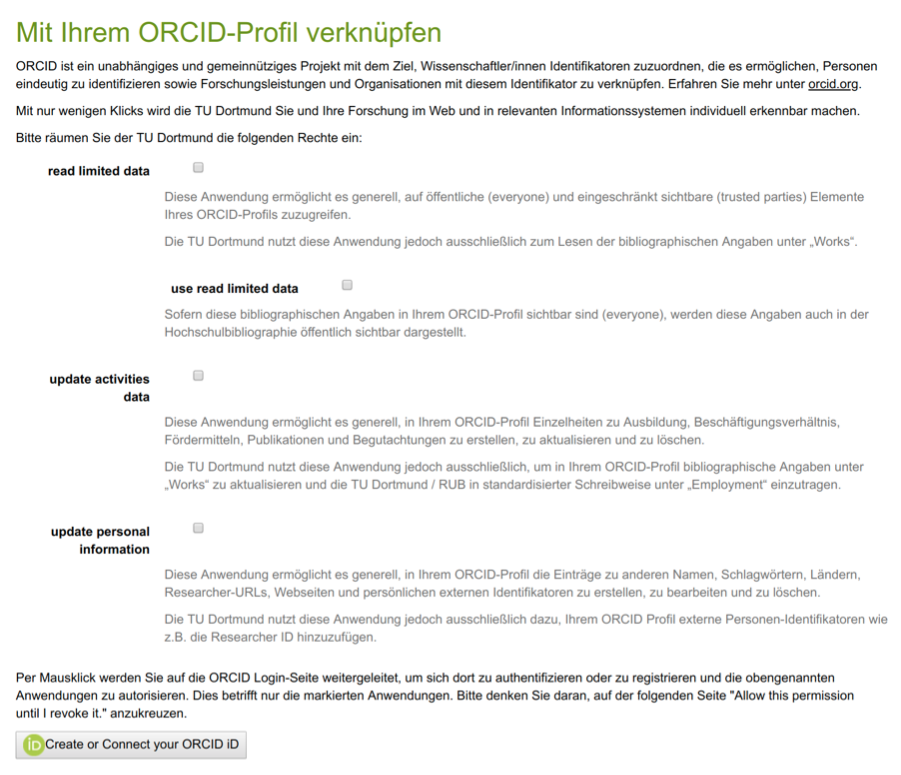 Im Standard-Verfahren von OAuth erfolgt eine Autorisierung so, dass die Person, die eine Anwendung autorisieren soll, nur darüber informiert wird, dass sie mit ihrer Zustimmung dem Betreiber der jeweiligen Anwendung Rechte einräumt. Ein Auswahl einzelner Rechte ist nicht möglich. Um größtmögliche Transparenz zu erzielen, war es der UB Dortmund wichtig, dass die Person selbst entscheiden kann, ob und welche Rechte sie der UB Dortmund einräumt. Dies erfolgt durch ein vorgeschaltetes Formular, indem ein Haken an die jeweilige Textpassage gesetzt werden kann. Nur diese ausgewählten Rechte werden dann auch angefordert. Besitzende eines ORCID-Records können bis zu vier Haken zur Rechteeinräumung setzen, die sich auf die Rechte